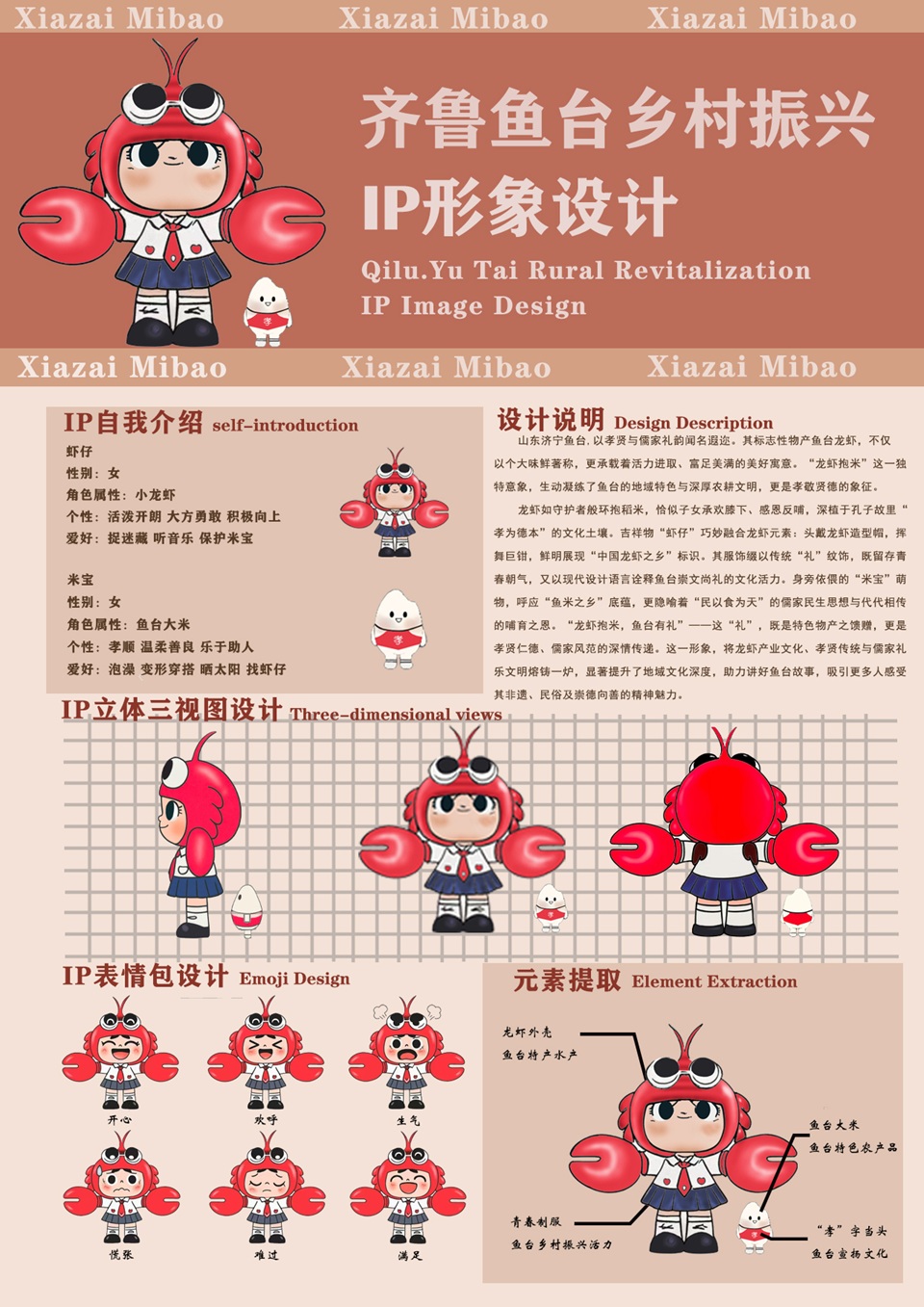 为以专业知识应用促进乡村振兴,提高鱼台特产品牌影响力和产品竞争力,实践队员深入挖掘“鱼米之乡”地域文化特色,以当地支柱产业“鱼台龙虾”和“孝贤香米”为原型,创作出兼具文化内涵与潮流元素的拟人化IP形象“虾仔”与“米宝”。在设计过程中,队员巧妙融合传统农耕文化与现代设计理念,通过鲜亮活泼造型和故事性形象塑造,既保留住农产品核心特征,又赋予其鲜明个性魅力。这些IP形象设计工作展现了青年学子将专业创意转化为服务乡村振兴的实际成果,为地方特色产业发展注入青春动能,推动鱼台优质农产品走向更广阔的市场。
