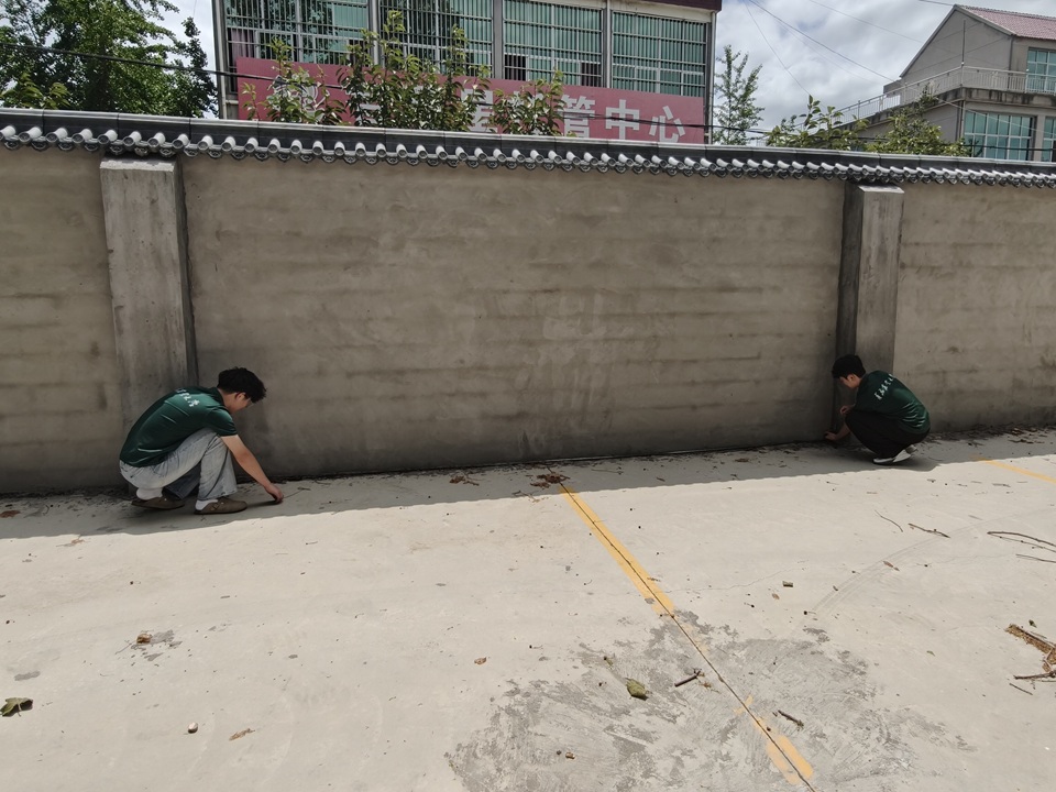 实践中,队员们通过测量墙体尺寸、记录墙面材质与平整度,结合重坊镇整体风貌与文化特色,为后续墙绘设计收集一手资料。实践团与两村村委和学校领导深入交流,明确墙绘需融入党建建设、孝文化和仁义礼智信等主题,既要展现村庄底蕴和校园特点,又要传递积极向上的精神风貌。针对倪村的党建文化底蕴、林孟场的孝文化传承和重坊镇中心初中的校园特点,队员们初步构思差异化设计方向,计划通过写实与艺术化结合的手法,让墙绘成为扮靓乡村的“文化名片”。
