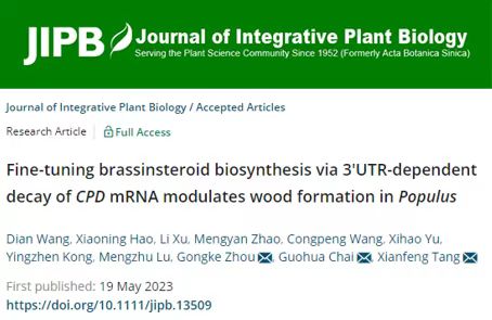 近日,JIPB 在线发表了WilliamHill中文周功克课题组题为“Fine-tuning brassinsteroid biosynthesis via 3’UTR-dependent decay of CPD mRNA modulates wood formation in Populus”的研究论文。该研究发现杨树中RNA结合蛋白PdGRP1能够结合BR合成基因PdCPD1的3’ UTR区富含GU的元件并介导其降解,进而调控BR的合成来影响杨树木材的发育。