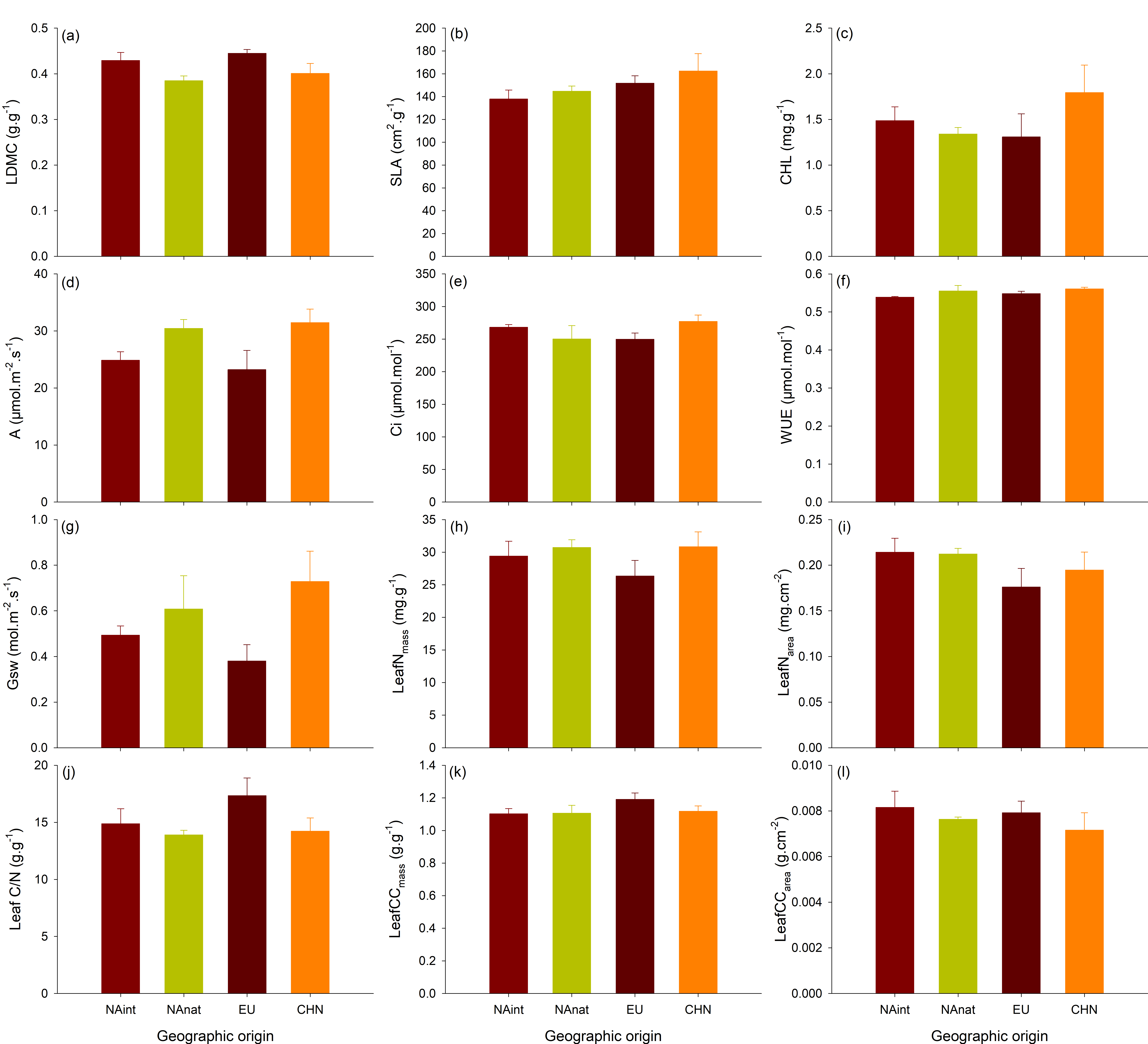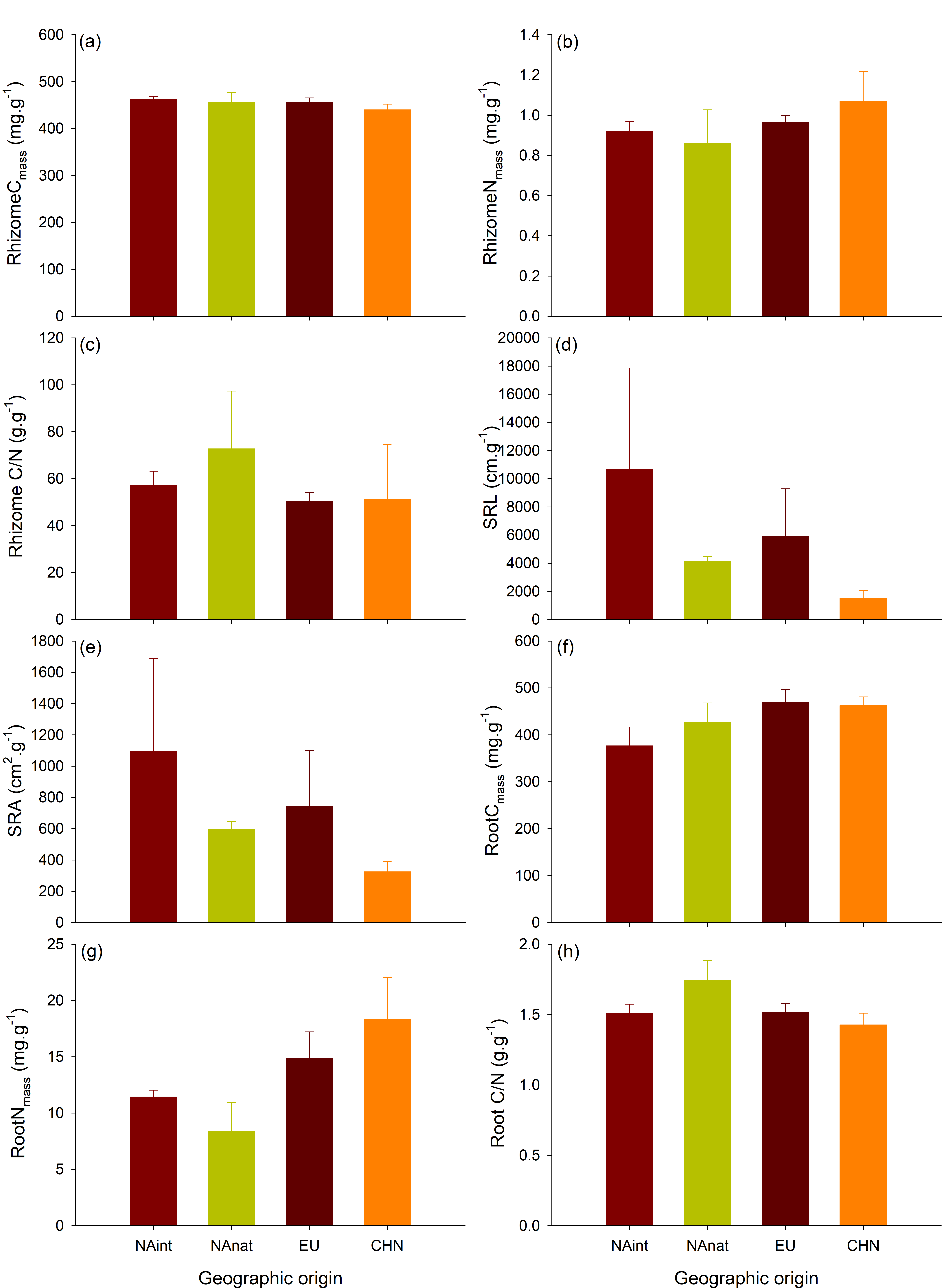 研究发现,无论是生长期抑或衰亡期,不同芦苇地理类群在叶与地下部分功能性状皆无显著差异,这一发现挑战了前人对于单倍型M具有“快性状”的判定。