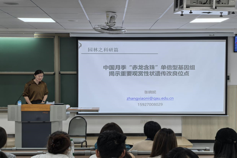 讲座中,张晓妮以《中国月季“赤龙含珠”单倍型基因组揭示重要观赏性状遗传改良位点》为题开展学术分享。张晓妮介绍,月季作为世界著名观赏花卉,经过种间及种内杂交,已培育出近3.5万个栽培品种,且多数栽培品种具有高度杂合性。同时,她通过对相关研究的系统阐述,解析中国月季四大老种在月季育种进程中的关键遗传贡献,助力学生提升科研思维与学术素养。