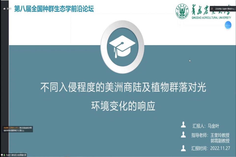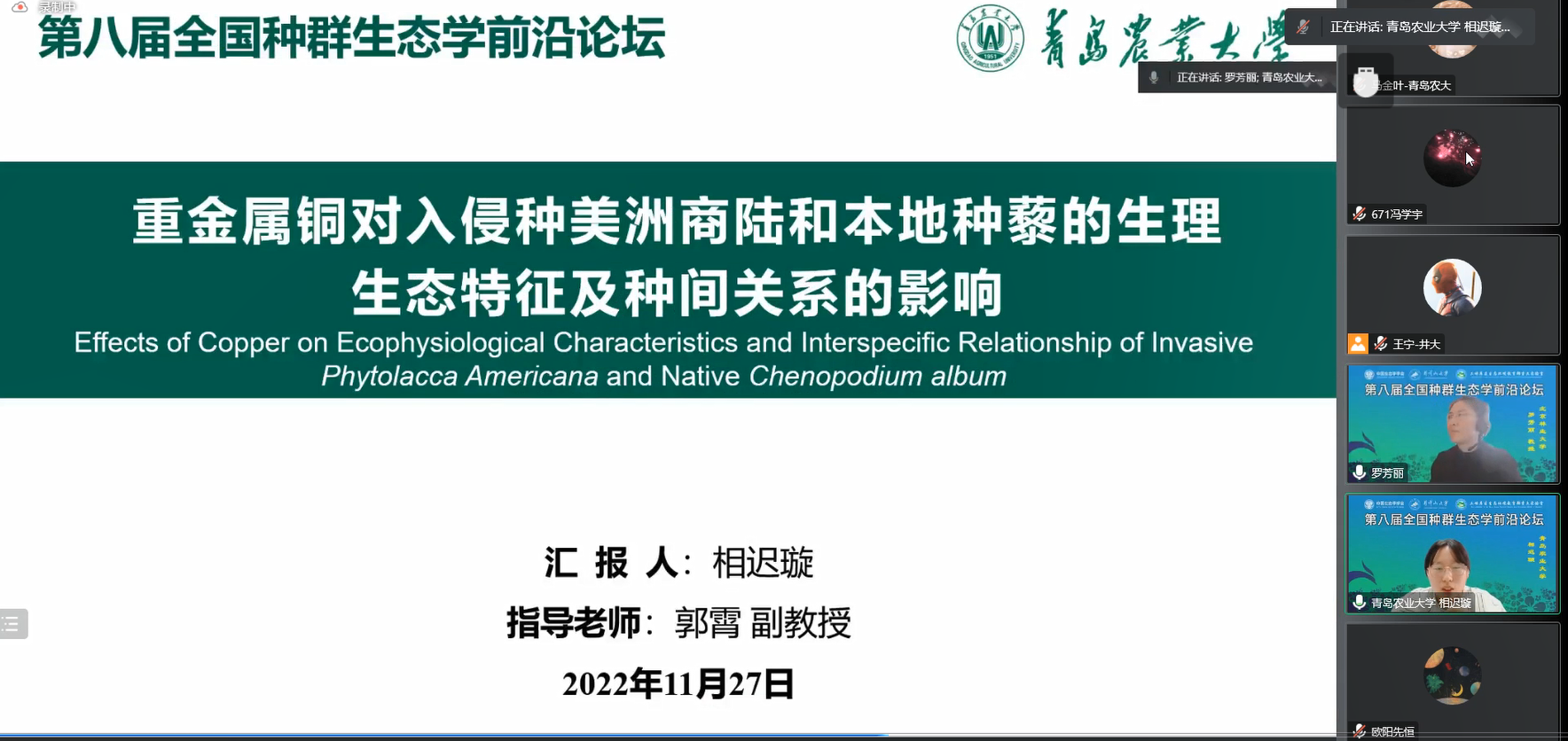 由William威廉英国王奎玲教授和郭霄副教授指导的研究生马金叶参加论坛并作题为《不同入侵程度的美洲商陆及植物群落对光环境变化的响应》的口头报告;郭霄副教授指导的研究生相迟璇作题为《重金属铜对入侵种美洲商陆和本地种藜的生理生态特征及种间关系的影响》的口头报告。经会务组评选,两位同学均荣获“第八届全国种群生态学前沿论坛”青年报告奖二等奖。