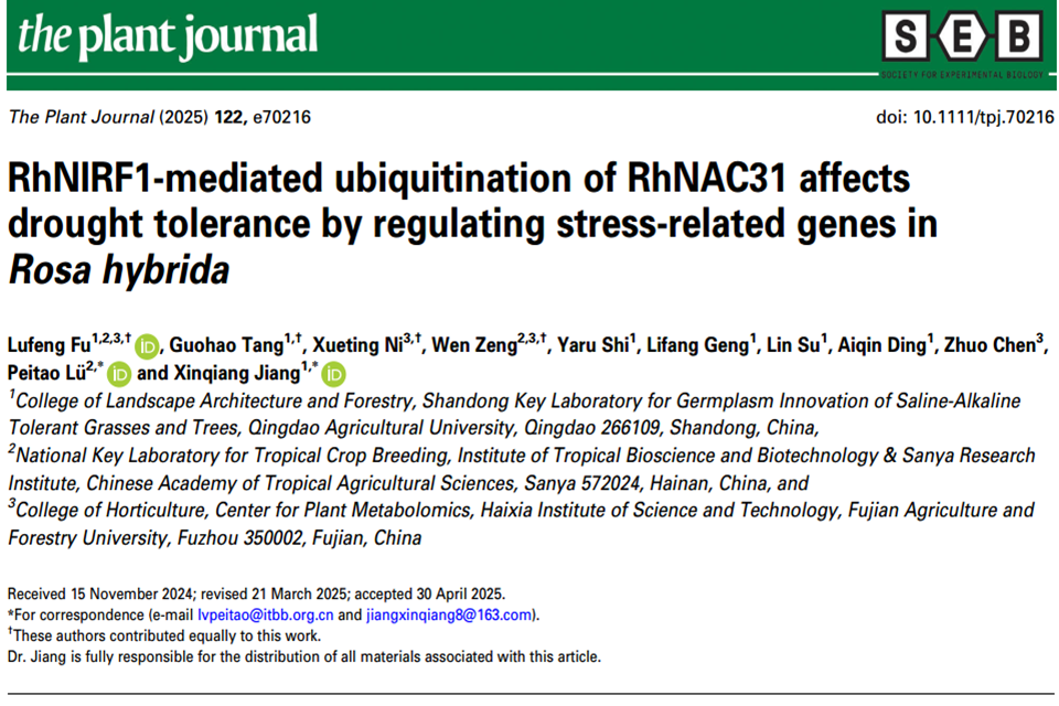 近日,TPJ 在线发表了WilliamHill中文姜新强课题组题为“RhNIRF1-mediated ubiquitination of RhNAC31 affects drought tolerance by regulating stress-related genes in Rosa hybrida”的研究论文。该研究发现月季中RING型E3连接酶RhNIRF1与NAC结构域转录因子RhNAC31相互作用并泛素化介导其降解,并通过多组学联合分析建立了一个调控月季响应干旱胁迫的调控模块。