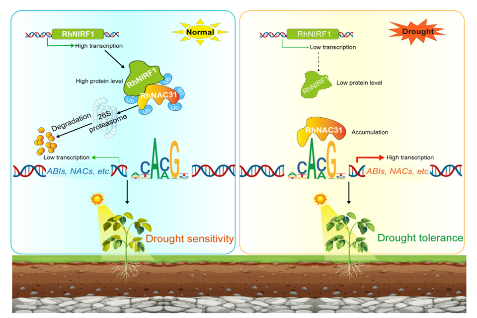 月季是重要的花卉作物,具有重要的经济价值,广泛用于城市园林绿化。然而,干旱等非生物逆境胁迫影响了月季的生长、发育和开花等生物学过程。课题组前期报道了过表达月季 RhNAC31能够增强转基因拟南芥对多种非生物胁迫的耐受性(Ding et al,2019)。通过酵母双杂交(Y2H)筛库获得了RING型E3连接酶RhNIRF1能够与其互作(Ding et al,2020)。在本研究中,进一步解析了RhNIRF1能够对RhNAC31进行泛素化修饰,降低蛋白稳定性,促进其降解,降低RhNAC31对其下游靶基因的调控。干旱胁迫时,RhNIRF1蛋白丰度降低,该修饰机制功能减弱,促进RhNAC31对其下游靶基因的调控,提高月季对干旱胁迫的适应。该研究通过整合遗传学和分子生物学分析以及多组学分析,证明了RhNIRF 1泛素化修饰RhNAC31,并发现RhNAC31直接与多个胁迫相关基因(RhABI1,RhNAC083)的启动子结合,从而在应对干旱胁迫中发挥积极作用。